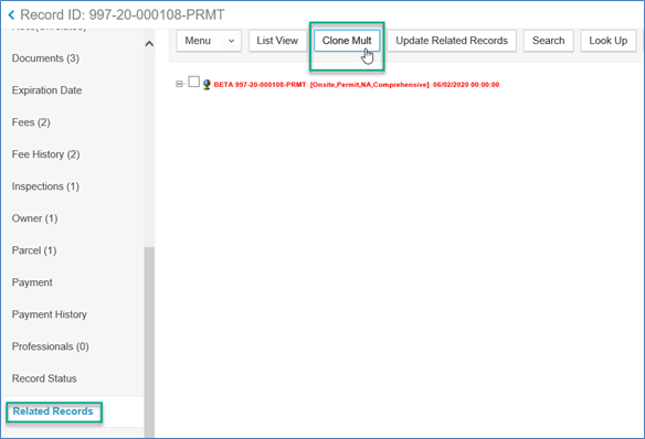 Start by verifying that there hasn't already been an Onsite Annual Service Master record created, by clicking on the Related Records tab in the left navigation, you should only see one record listed. Next, click the Clone Mult button.