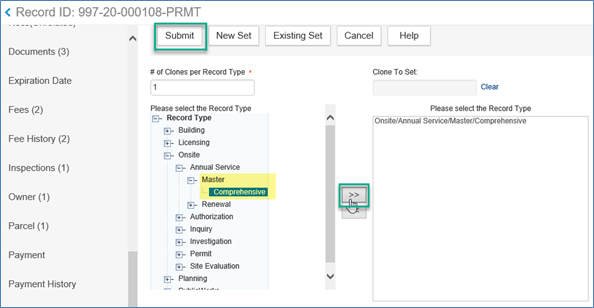Navigate to the record type Master (Record Type > Onsite > Master > Comprehensive), then click on the double arrow button to move the selected record over into the box on the right of the screen. Then click Submit to continue.
