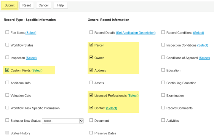 On this screen you will select the information from the original permit record that will be copied into the new Master record. It is recommended to only bring over the Parcel, Owner, Address, Licensed Professionals, and Contact from the center column and the Custom Fields information from the first column. Click in the check box to select and then click Submit.