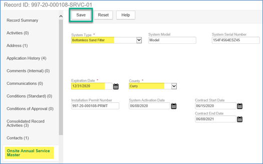 Now, the Contract Start and End Dates can be entered on the Master record to help track maintenance contracts.  Also, be sure to verify all information is accurate (Address, Parcel, Owner, Licensed Professional, Contacts, System Type).