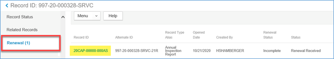 Note: You will be required to update on the Renewal record any missing required data, Applicant, and the annual inspection Y/N questions.