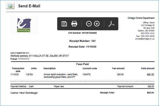 - Navigate to the Payment page > submit payment in full. You can print or email the Receipt document to the customer for their records.