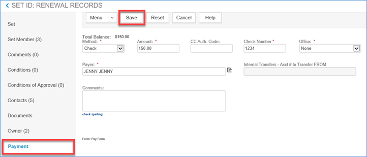 You can process multiple Renewal records through a Set Payment. You may want to do this if a maintenance provider submits multiple annual inspection reports to your office with a single check. This process is not available through Citizen Access.