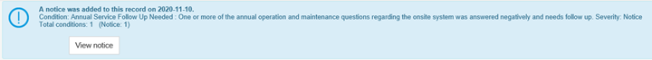 If any of the annual inspection Y/N questions were answered negatively, a Notice Condition will automatically be added to the Renewal and Master record. These records may need follow up with the maintenance provider or property owner.
