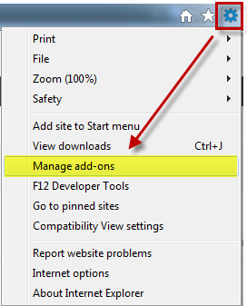 2. Next, go to the Tools icon in the upper right corner of Internet Explorer > click Manage add-ons: