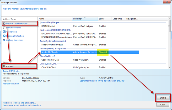 3. Select Toolbars and Extensions > make sure All add-ons is selected > select Adobe PDF Reader > click Enable to enable the Adobe Reader add-on in Internet Explorer.  Close the windows and try again.