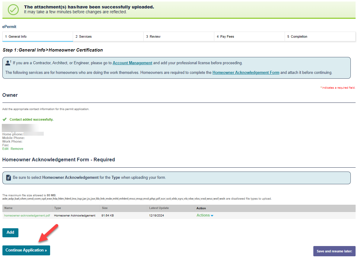 Step 4: Enter owner contact details and upload homeowner acknowledgement form