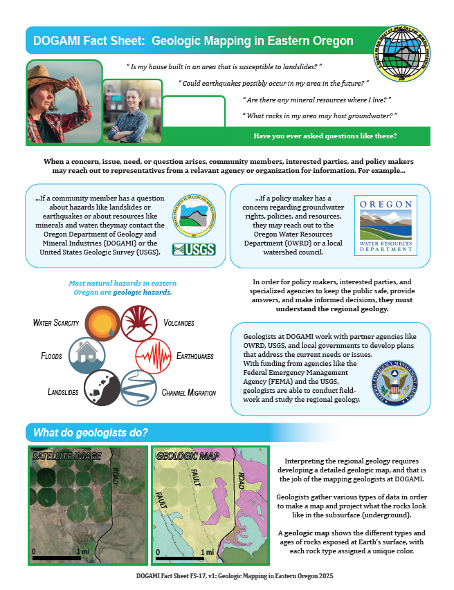The dramatic landscapes of Eastern Oregon provide a wealth of natural resources that keep local communities thriving. Eastern Oregon is also susceptible to natural hazards like floods, channel migration, drought, and earthquakes. With the help of partner agencies, geologists at DOGAMI produce high-precision geologic maps that provide the public, policy makers, and other interested parties with the information they need to make informed decisions that keep their communities safe and flourishing. For a brief explanation of how the geologic mapping of Eastern Oregon helps mitigate natural hazards and manage natural resources, check out the tri-fold brochure. To continue learning more, check out the fact sheet. And if you really want to dive in, click the link to access the interactive Experience Builder!