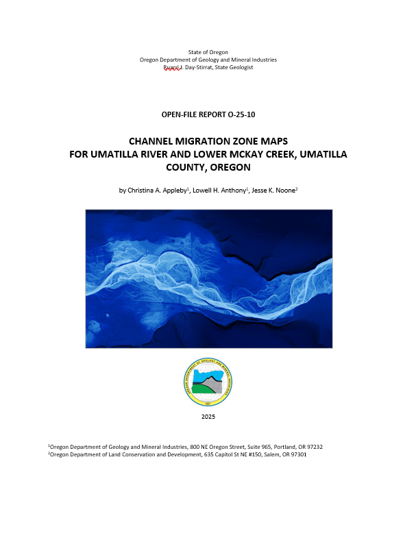 DOGAMI Open-File Report O-25-10, Channel Migration Zone Maps for Umatilla River and Lower McKay Creek, Umatilla County, Oregon, by Christina A. Appleby, Lowell H. Anthony, and Jesse K. Noone; 78 p. report, 19 p. appendix, two .xlsx spreadsheets, one Esri® geodatabase with internal metadata, external metadata in .xml format.