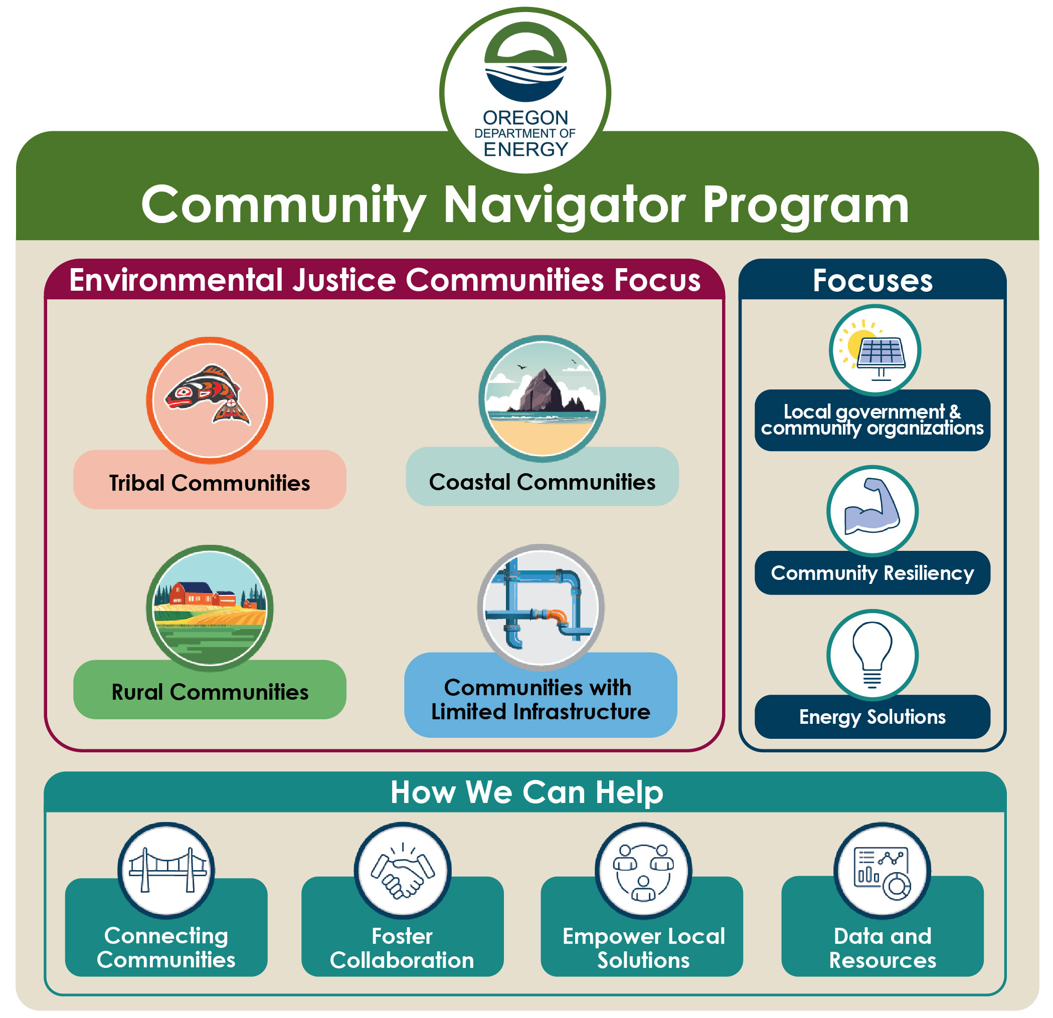 ODOE’s Community Navigator program is designed to empower local communities throughout the state of Oregon in their pursuit of energy solutions. We believe that everyone deserves access to the resources and knowledge needed to create a more safe, equitable, clean, and sustainable future.