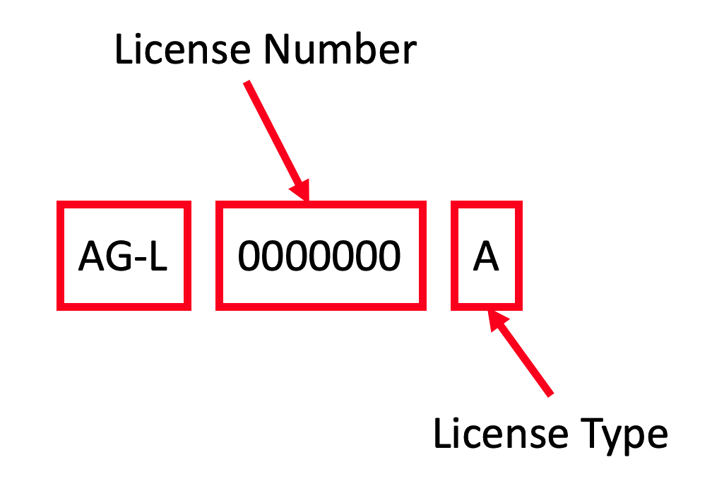 license numbers begin with “AG-L" followed by a 7 digit license number and a