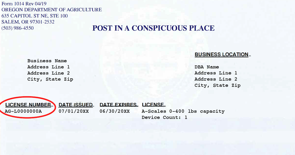 license form 1014 issued by the Oregon Department of Agriculture. All
