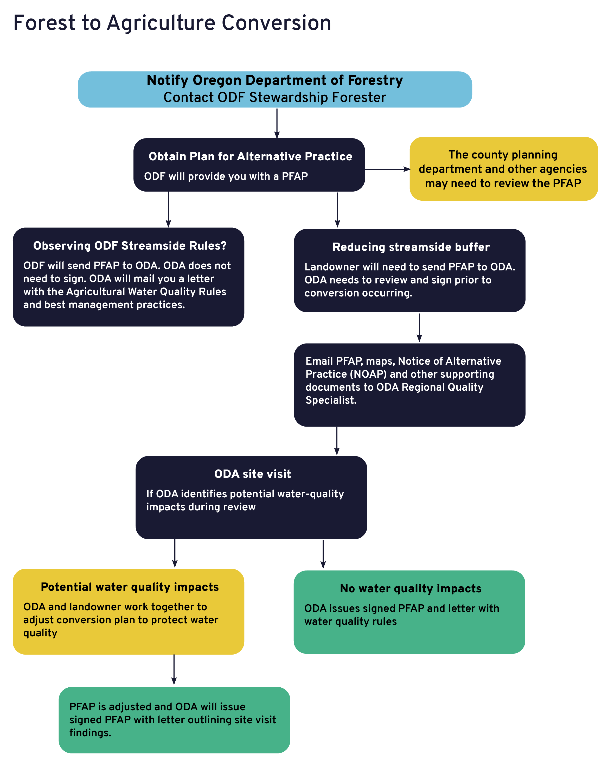 - a. If your conversion from forest to agricultural land observes all ODF Rules pertaining to water quality protection, then ODF will contact ODA and provide them with a copy of the PFAP for review. This type of conversion does not require a signature from ODA on the PFAP. ODA will mail the landowner a letter summarizing the applicable Agricultural Water Quality Rules and best management practices to help maintain compliance throughout the conversion process.
