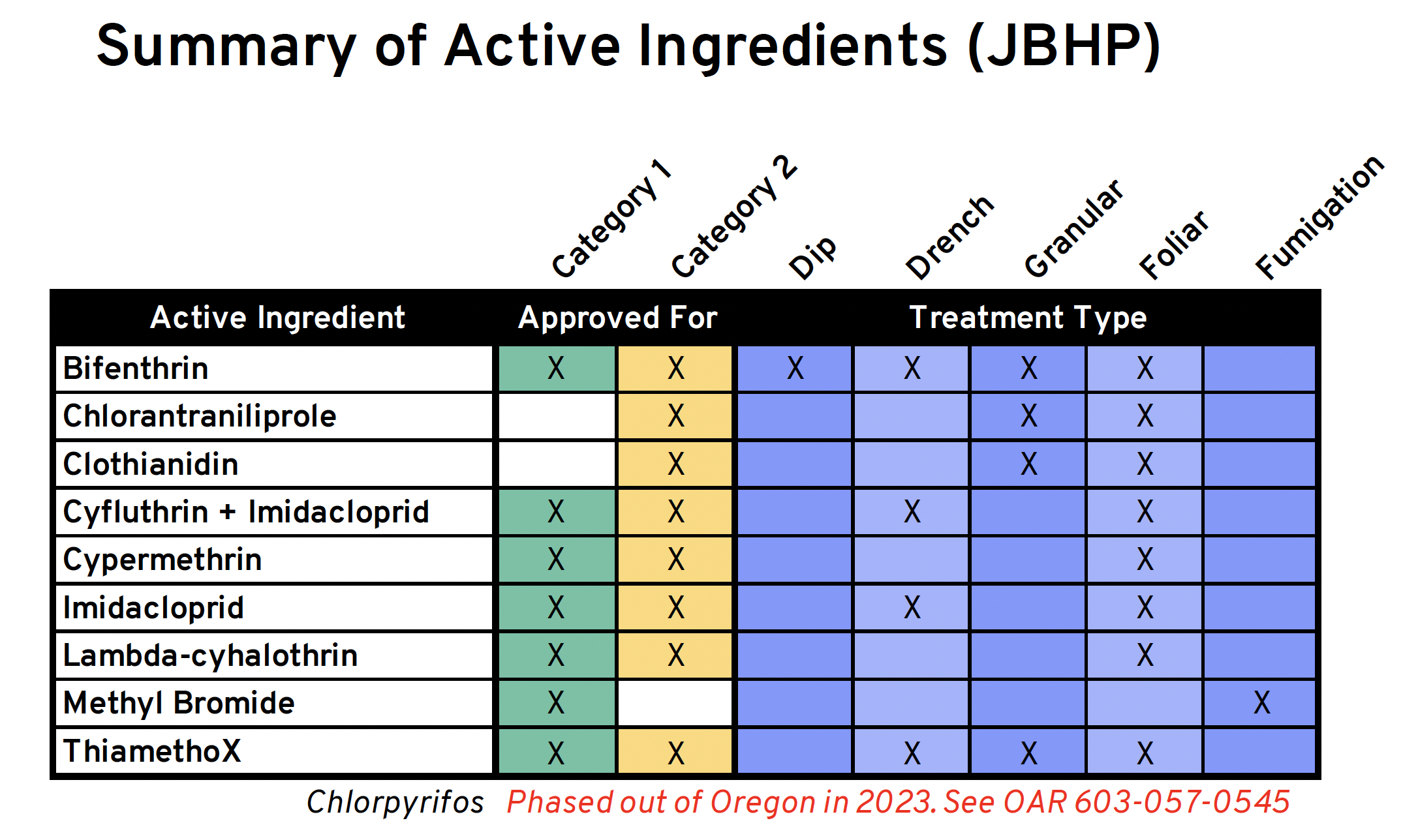 The JBHP has a table listing active ingredients and products that have been agreed upon among the states. Not all of these are registered for use in Oregon, and not all of the products registered for JB in Oregon are on the approved JBHP table. Please review the attached document to see lists of JB treatments in Oregon and those which are also found in the JBHP list.
