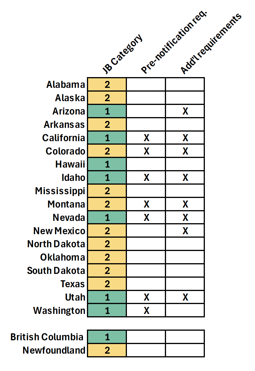 The JB regulatory status map visualizes all 50 states and Canadian territories, coding them as Cat 1, 2, 3, or 4. This map is updated annually. Regulatory status is determined by the National Plant Board. The JB regulator status map for Canada is also available.