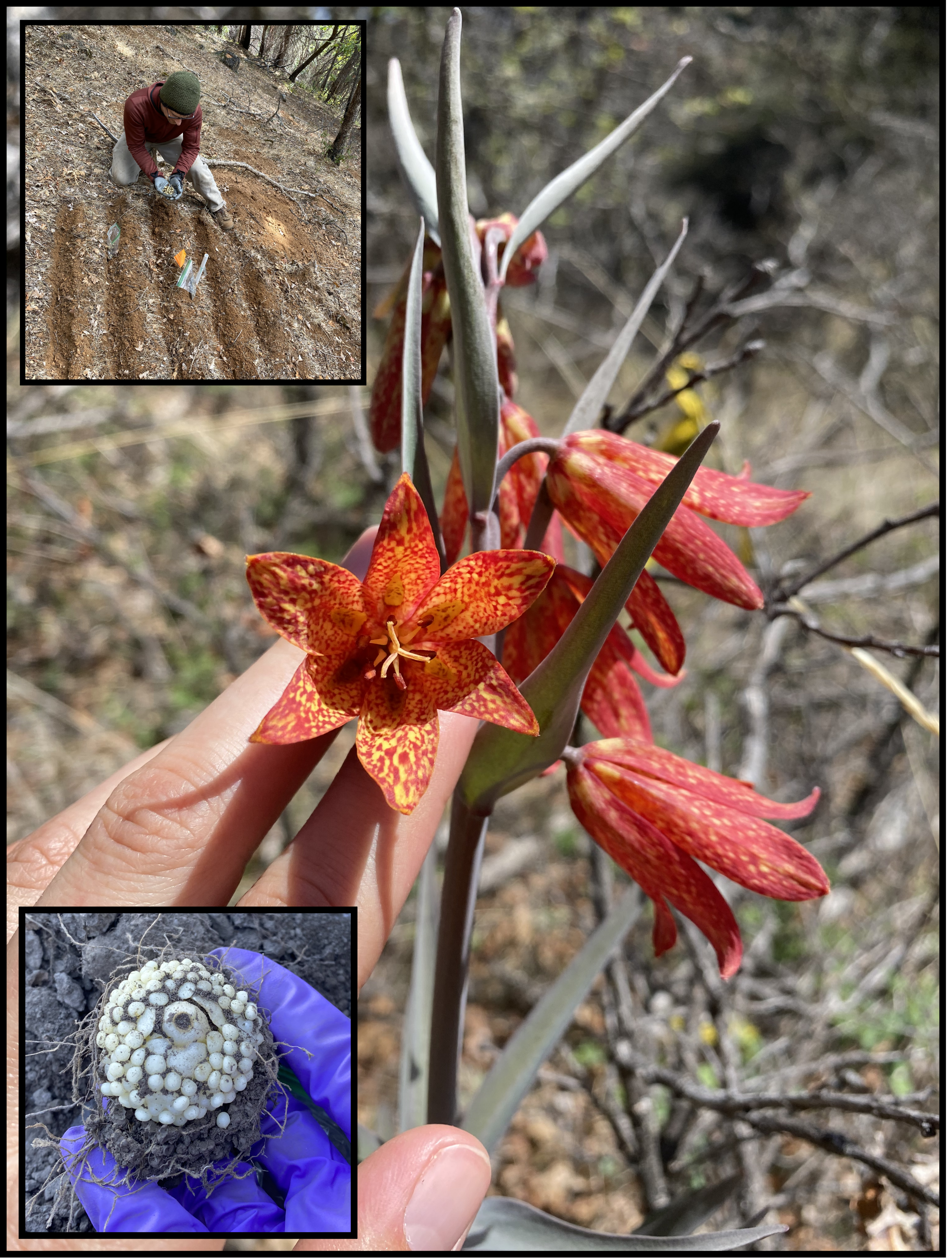 ODA continues to lead the recovery of the endangered Gentner's fritillary through the cultivation and collaborative transplanting (top inset) of bulbs and bulblets (bottom inset).