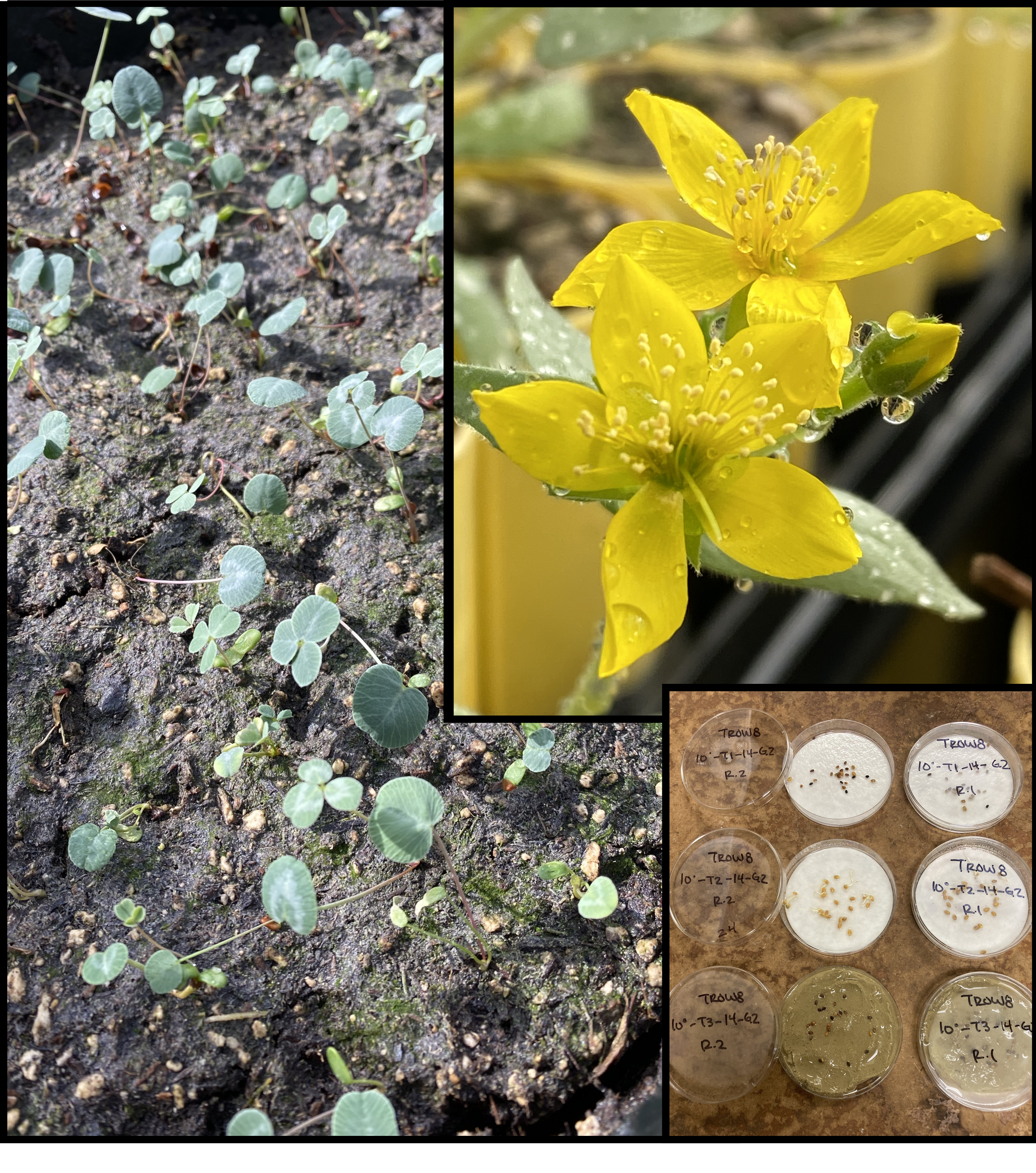 Owyhee clover (left) and flowering soft blazingstar (top right) in cultivation at OSU greenhouse facilities; the Native Plant Conservation Program worked with the OSU Seed Lab for the germination trial (bottom right) of seeds from both species.