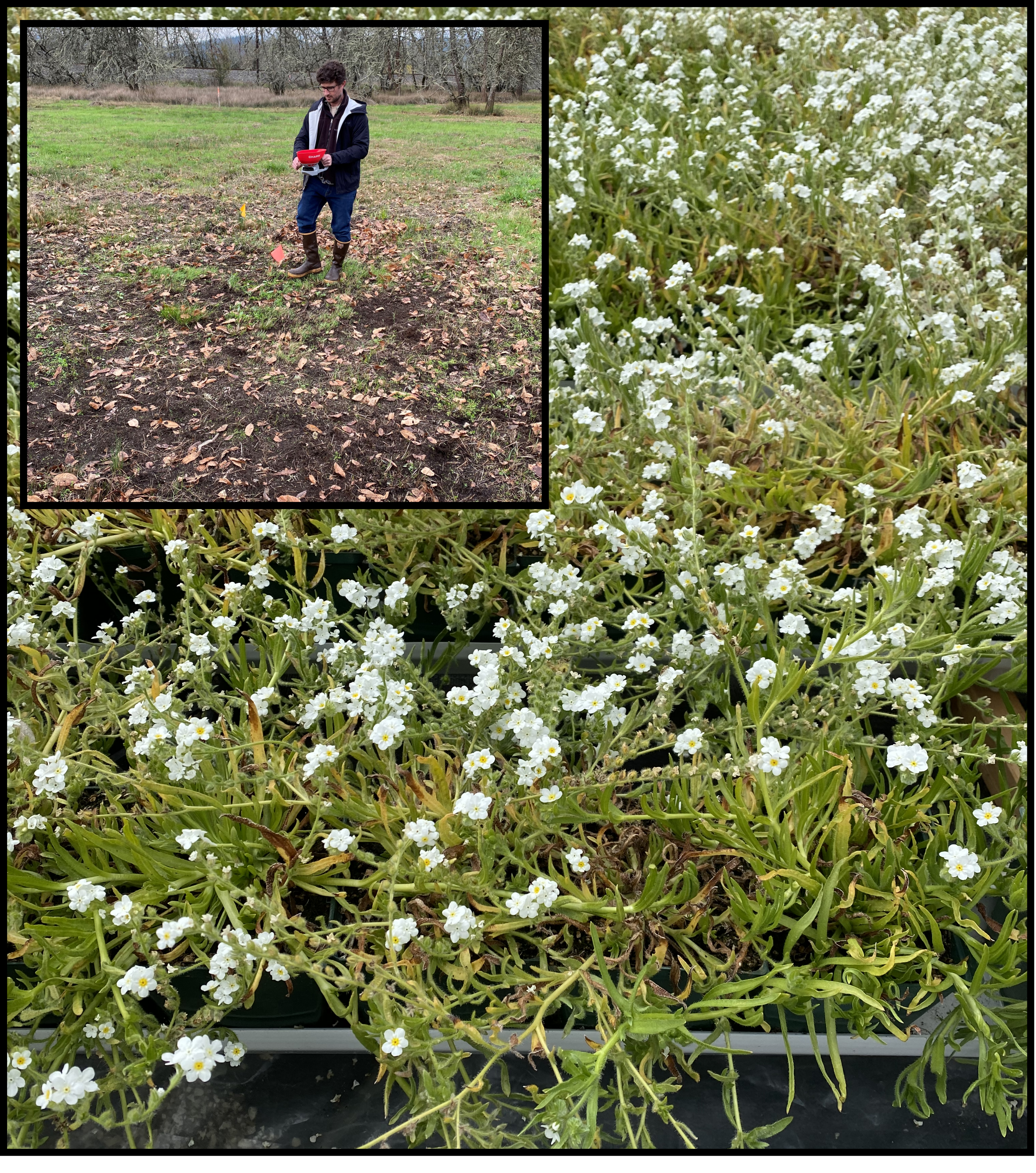 Rough popcornflower growing in pots in a unique bottom-watering system; seed collected from these plants were cleaned and dispersed at a protected site in Sutherlin, Oregon (inset).