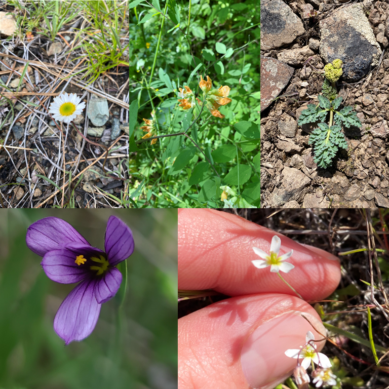 From top, clockwise: Erigeron stanselliae, Lathyrus holochlorus, Lomatium ochocense, Meconella oregana, and Sisyrinchium hitchcockii.