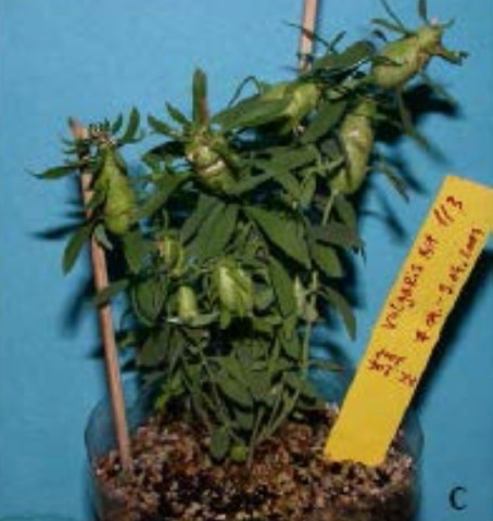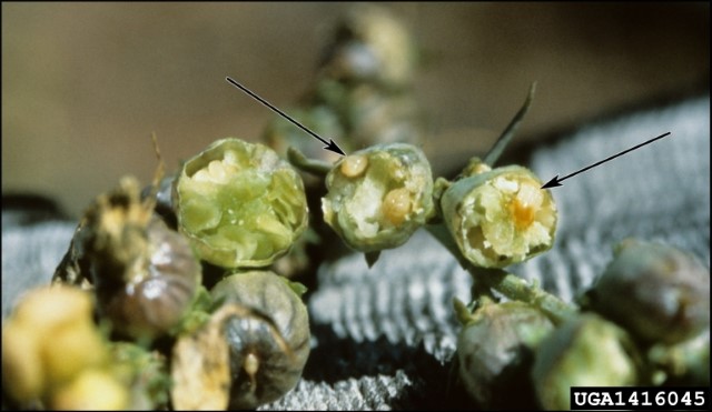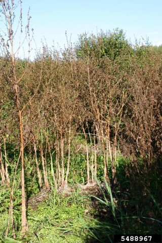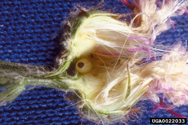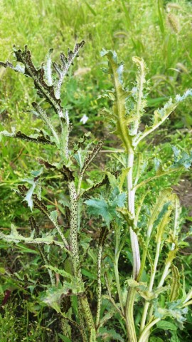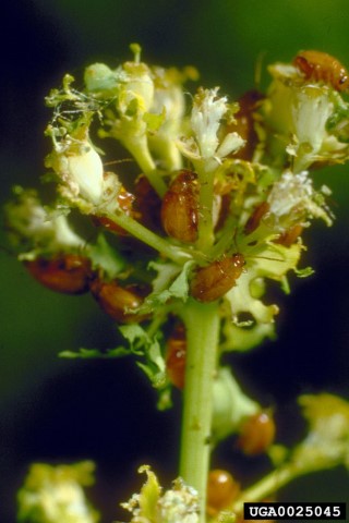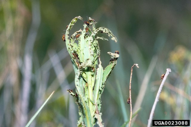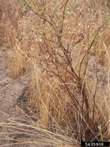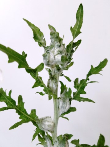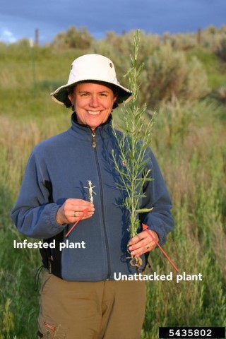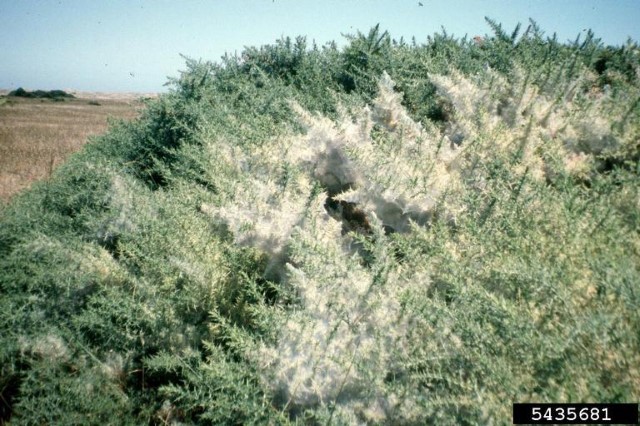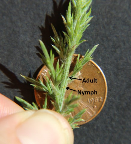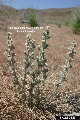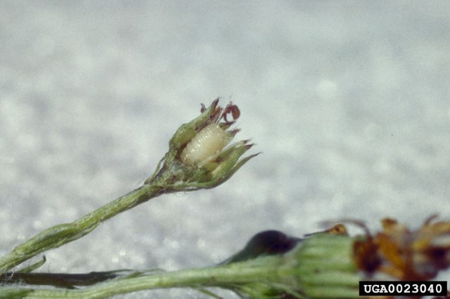 Several hundred to a few thousand mites are found per infested plant. Mites feed on developing plant tissue that induces bud galls, fuzzy leaves, and thick curled leaves/stems. Damage results in stunting of the plant and reduces seed production. Infestation rates are variable from 1-3% in park settings to 60-95% in cultivated/disturbed sites.