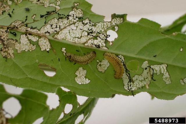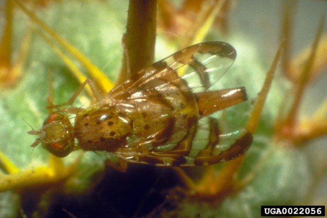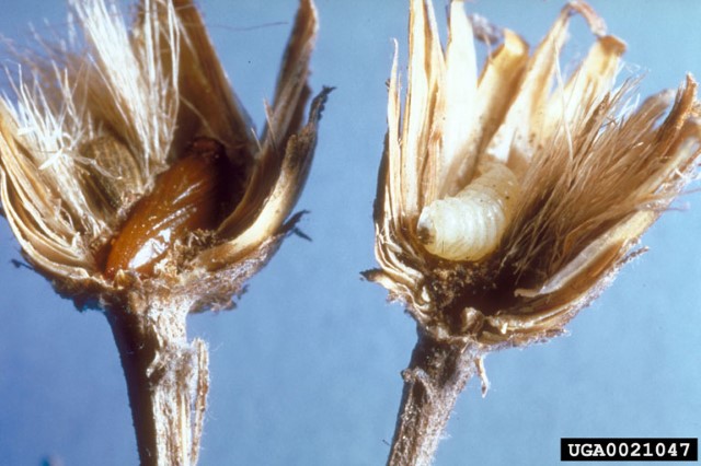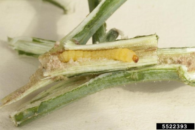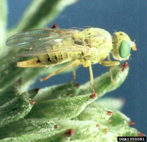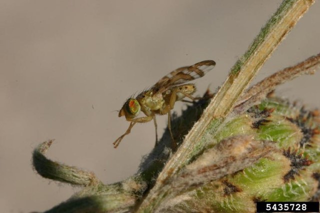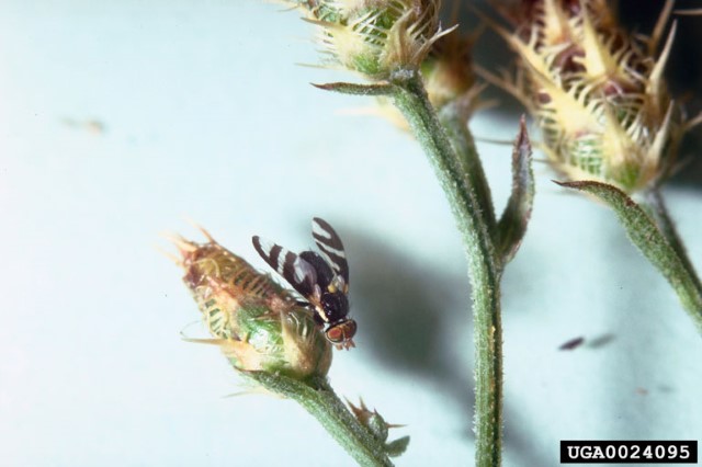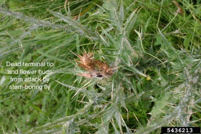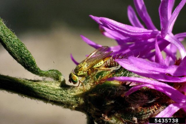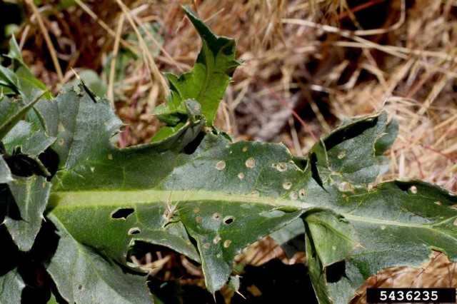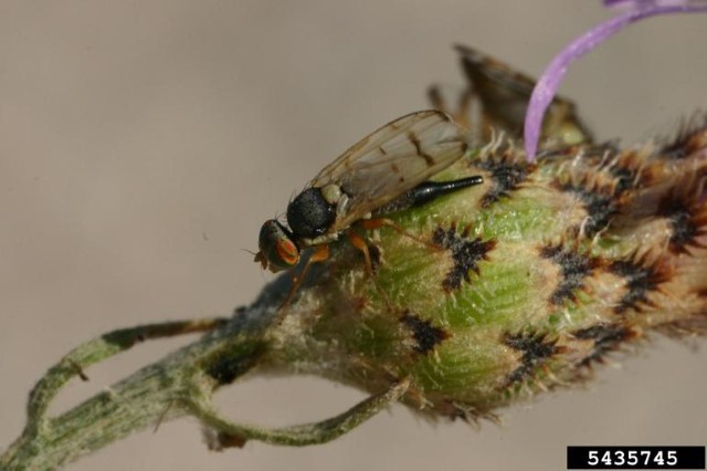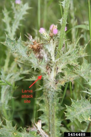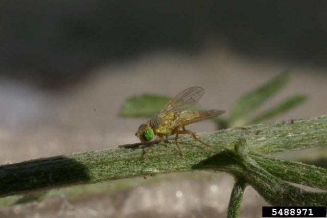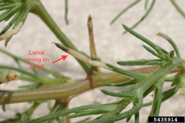 Adults feed on and lay in leaves. Larvae mine down the leaf and feed in root crown. In lab setting, feeding could decrease plant size by 23%. Impact may be greater once introduced in the field where plants experience environmental stressors. 3-4 agents per plant on average. In the field, agents reduced seed fertility by 15%.