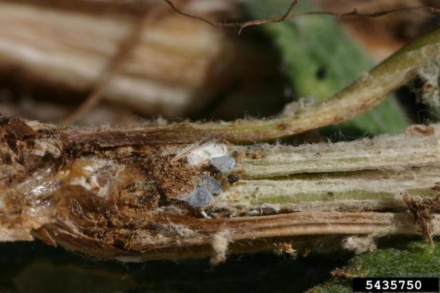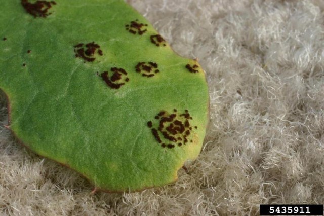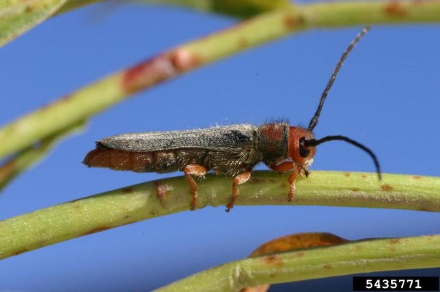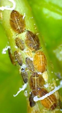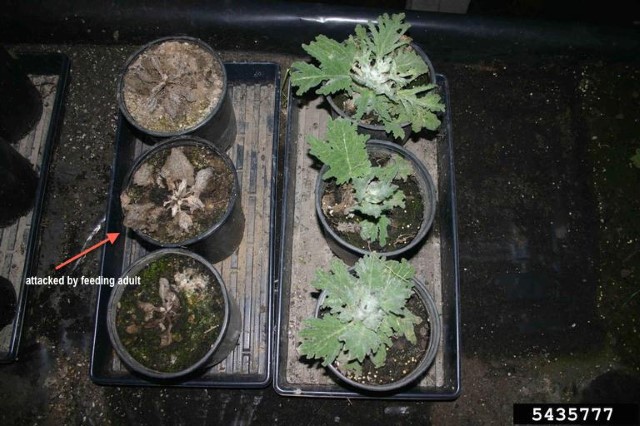 Larvae and adults suck sap from phloem cells of leaves and stems. In lab settings, psyllids reduced attacked plant and root biomass by 50%. Feeding damages meristems and causes leaf curl where psyllids hide from predation. This depletes plant energy supply and reduces leaf area for photosynthesis.