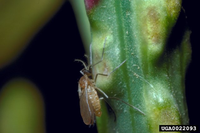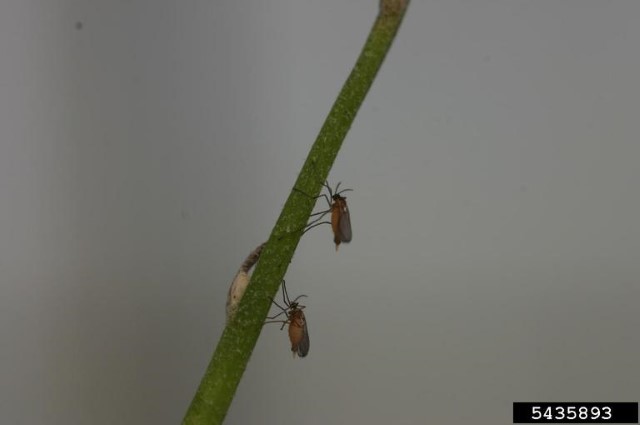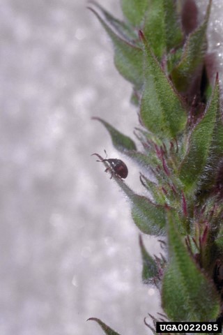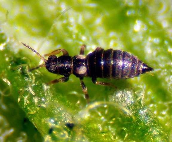 Adults are 1-2 mm long. Easily confused with flower thrips. Eggs laid in tender new stem growth. 76 eggs per female with 32-day life span as adults. Two generations per year are expected with peaks in June and August. Slow to spread, as winged forms are only produced at high thrip density and typically spread by walking or being blown onto neighboring plants.
