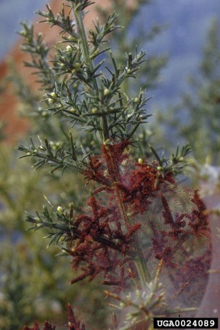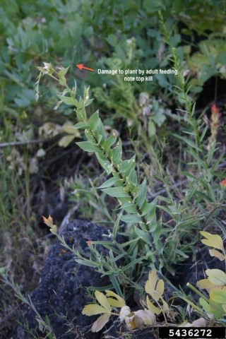 Thrips puncture plant cells and suck up contents. Feeding results in mottled white leaf spots. Thrips target new growth and can reduce flowering. In lab settings, thrips could stop seedling growth and kill it within 65 days, even at low thrip density. Small gorse bushes (1 ft) attacked were 25% smaller than healthy plants. Does not attack broom species.