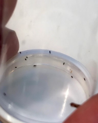 Collectable year-round but best when warm weather brings fresh gorse growth and moved thrips will have time to recover before winter. Adult thrips can be knocked off branches and onto beating sheets with a stick, then aspirated into vials. Thrip covered branches can also be clipped, paper bagged sealed during transport, and infested branches tucked securely into new gorse site bushes. Be careful not to move predatory arthropods or seeds when collecting thrips. 300 thrips is the minimum release size.