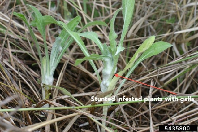 In experimental tests, galled plants produced 16% less above-ground biomass, 41% less below-ground biomass, 39% less flowering stems, and 58% fewer new stems, compared to control plants. Field observations concur on stunted shoots and flower prevention. Impacts in Oregon are not known.