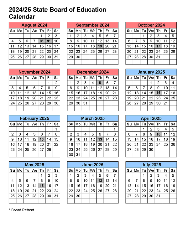 2025-2026 State Board of Education Meeting Calendar: Board retreat August 14-15. Board meetings: September 18, October 16, December 11, January 15, February 19, March 19, April 16, May 21, June 18 Public Comment at Board Meetings