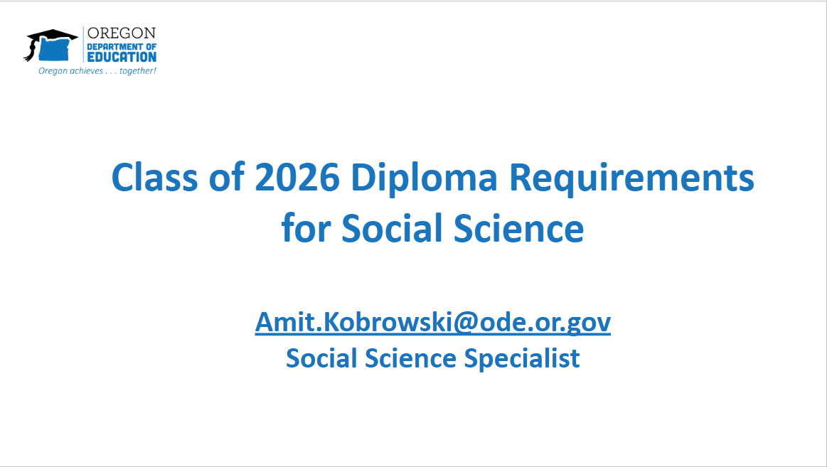 Ready to implement Oregon's new social science standards? ODE has created comprehensive professional learning resources and toolkits designed for educators at every level. Whether you're a teacher looking for free online courses, an educator leading professional learning needing presentation materials, or a school leader seeking communication resources for families, these ready-to-use packages will help you successfully adopt and implement the standards. Dive deep with six specialized Canvas modules , explore discussion guides, slide decks and family communication tools on the 2024 Social Science standards. These social science resources are available on