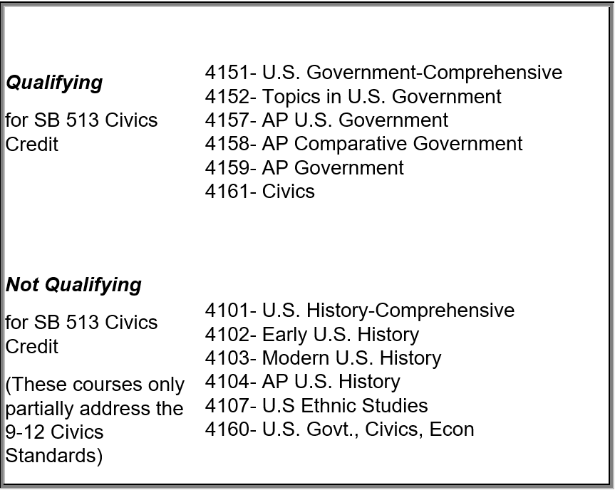 In the 2021 legislative session, the Oregon Legislature adopted Senate Bill 513 requiring students to earn 0.5 civics course credit to fulfill graduation requirements, beginning with the class of 2026 (current 8th-grade students).