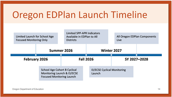 Oregon EDPlan is being implemented in phases to allow districts, vendors, and ODE to prepare, test, and adjust processes. Key milestones include vendor readiness, district testing periods, and staged monitoring implementation.