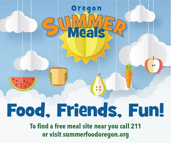 The Summer Food Service Program, also known as "Summer Meals", is available in hundreds of communities throughout Oregon, offering free meals and snacks to ALL kids 1-18. Community summer meal programs are open to all kids without paperwork or income verification, regardless of where they live. To receive a meal, kids can just drop by during a site's designated meal times.