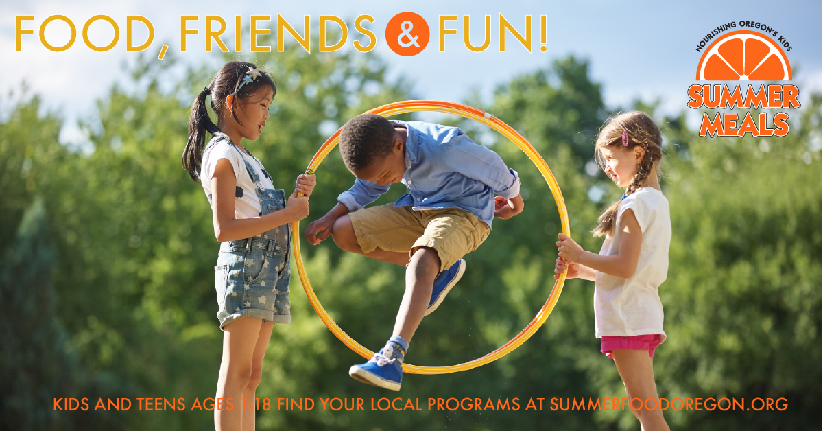 The Summer Food Service Program, also known as "Summer Meals", is available in hundreds of communities throughout Oregon, offering free meals and snacks to ALL kids 1-18. Community summer meal programs are open to all kids without paperwork or income verification, regardless of where they live. To receive a meal, kids can just drop by during a site's designated meal times.