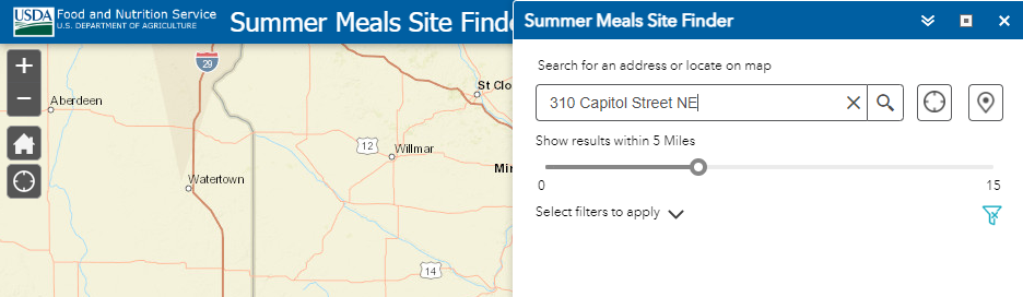 Step Two: View a list of nearby locations and their distance from you. The map will display blue dots (for on-site meals) and orange squares (for meals to-go) for nearby sites. Meals to-go are only available in rural areas.