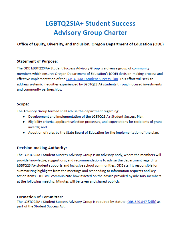 The LGBTQ2SIA+ Student Success Advisory Group is required by statute: ORS 329.847 (2)(b) as part of the Student Success Act.