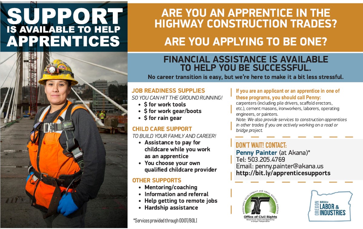 Apprentices who complete the Apprenticeship program will have skills to build a career and may eventually own their own construction businesses. Construction employers who develop their workforce through the program will have a diverse and highly skilled group of workers ready to accept future construction projects. And creating these family wage jobs improves Oregon's roads, which benefits the public.