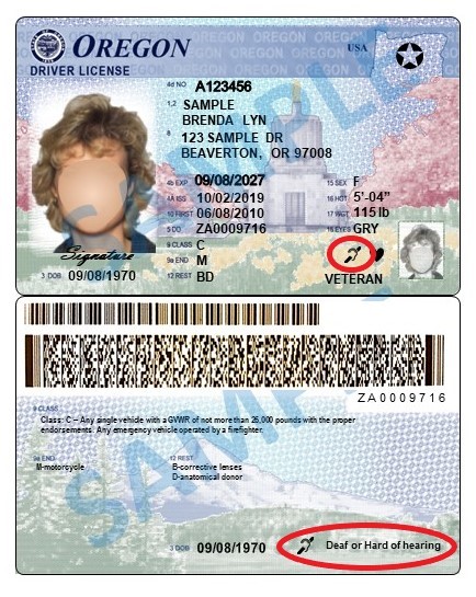 An Oregon resident who is deaf or hard of hearing may voluntarily apply to have the International Symbol of Access for Hearing Loss added to their driver license, driver permit, or identification card. The deaf or hard of hearing designation will also be visible to law enforcement through the DMV record.