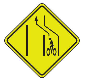 Bike Lane Ends – Used where the bike lane abruptly terminates and the rider must merge with the through lane of traffic.