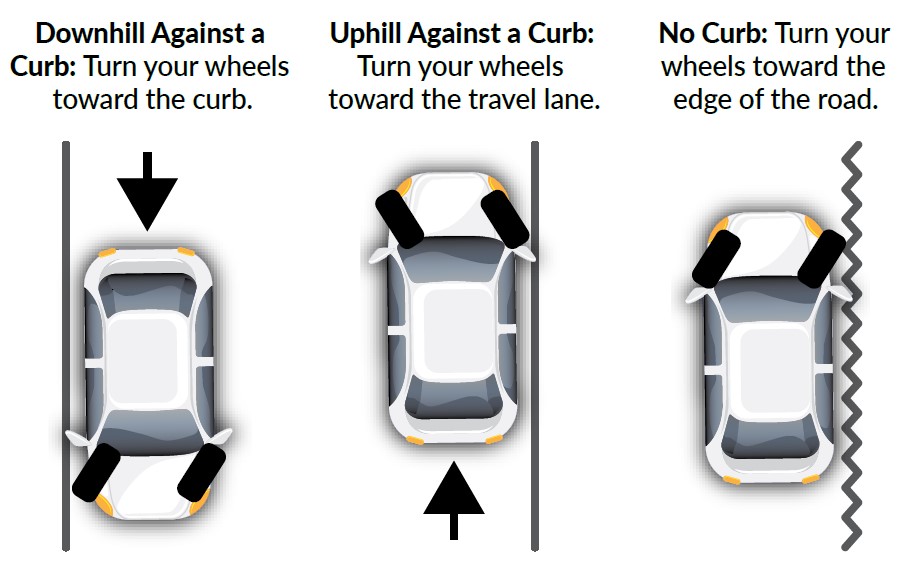 Always set your parking brake. Leave your vehicle in gear if it has a manual transmission or in park for an automatic transmission. Turn your front wheels as indicated below to prevent your vehicle from rolling downhill in case the brake fails.