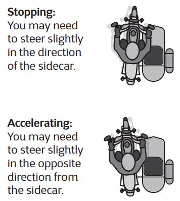 When operating a sidecar-equipped motorcycle, additional consideration needs to be given to the direction of the turn and amount of weight in the sidecar. When turning a motorcycle with a sidecar: