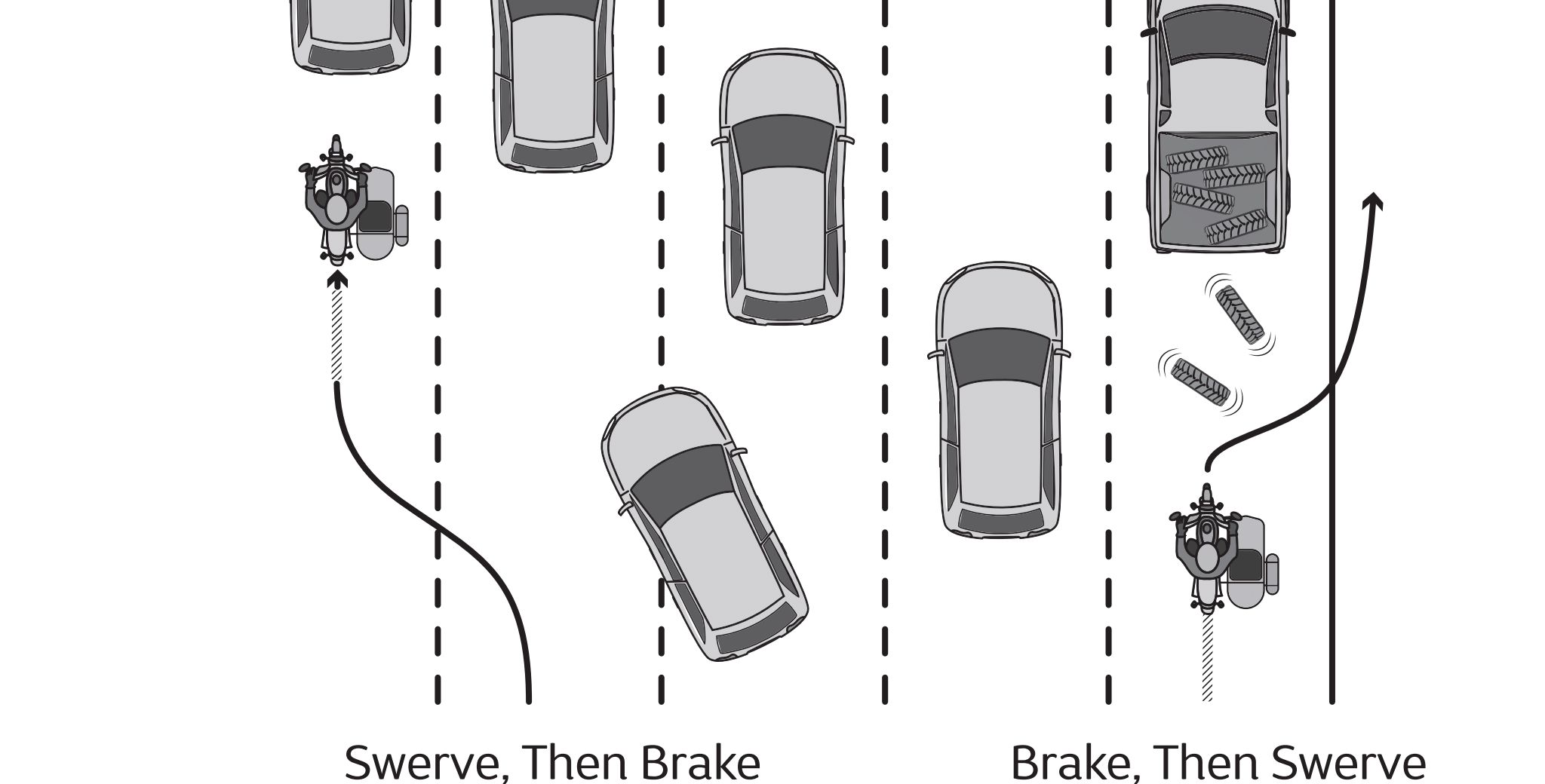 A three-wheel motorcycle is not as maneuverable as a two-wheel motorcycle. It is important to look well ahead to avoid the need for any sudden turns or swerving. Swerving is seldom the best option to avoid a collision. If swerving is required, brake either before or after the swerve, never while swerving. You should not attempt swerving unless you have proper skills and experience to do so. If you need to avoid a collision, the best option may be hard braking.