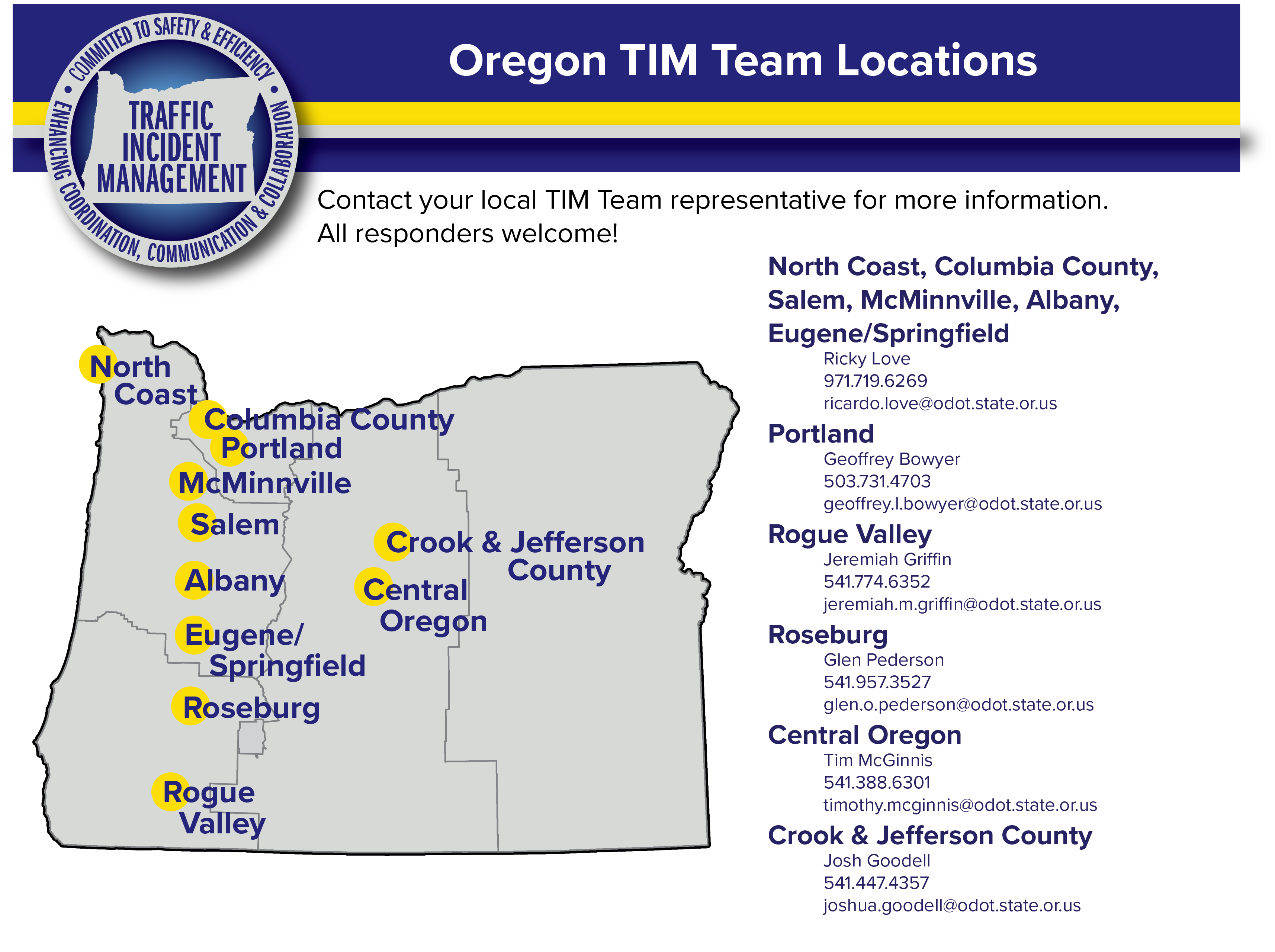 Oregon’s Traffic Incident Management Program is dedicated to improving the on-scene safety of our first responders, reliability of our highways and livability of our communities by increasing outreach and awareness of TIM practices.