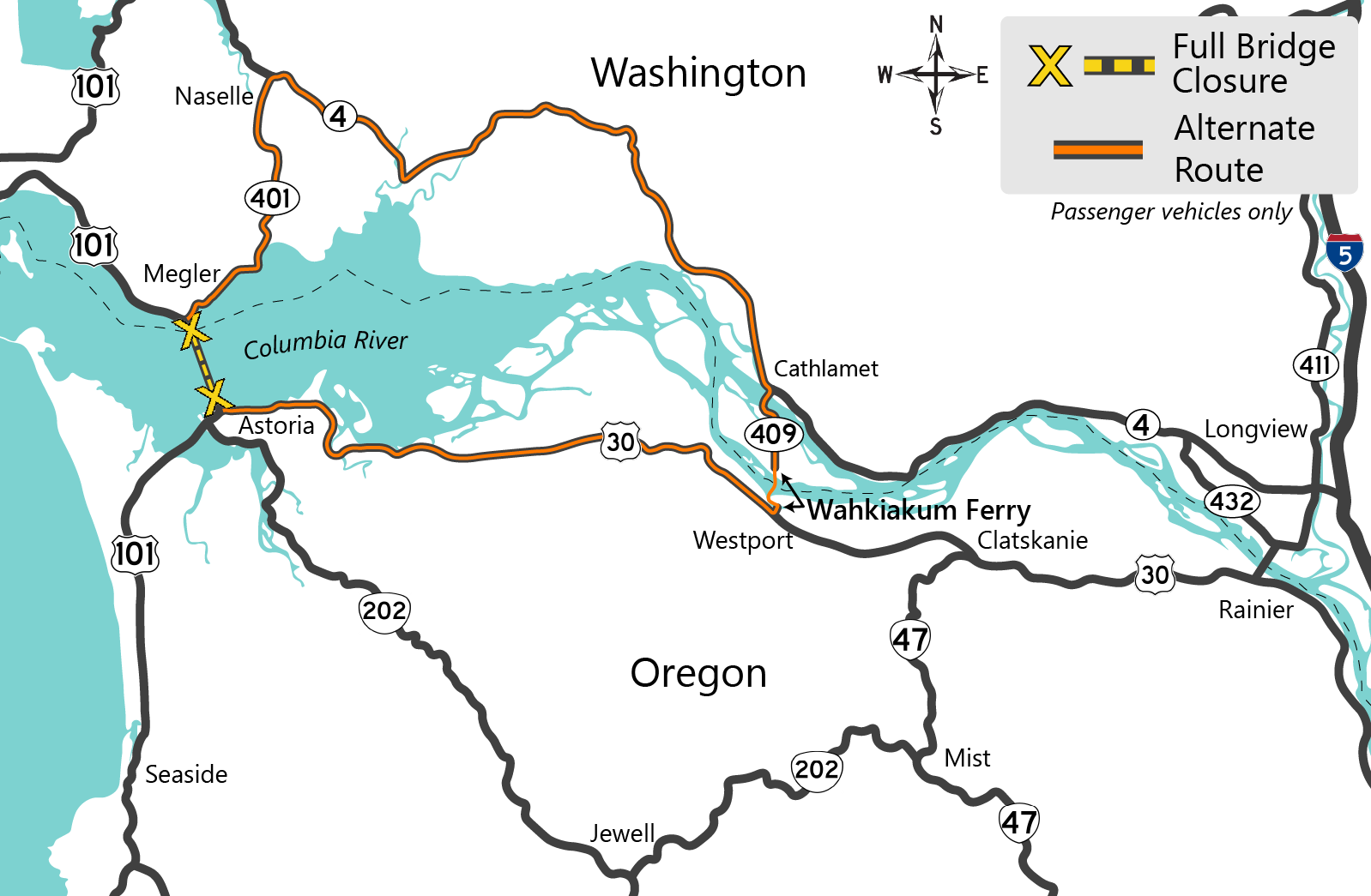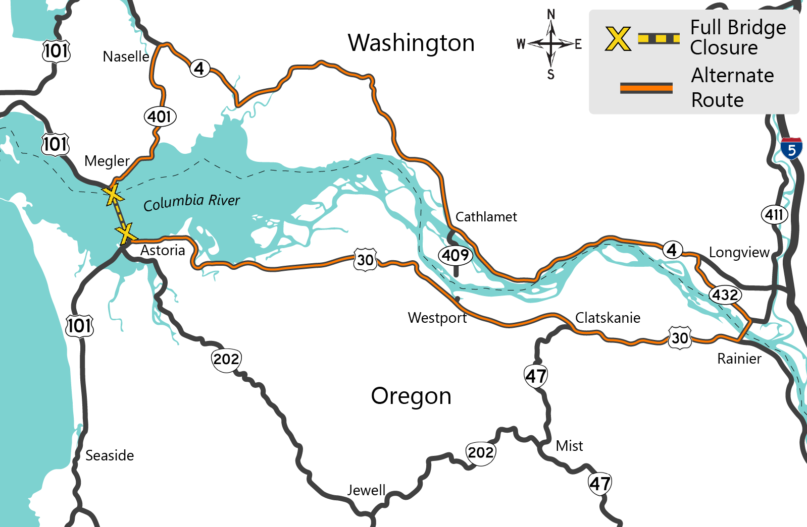 You can get around the U.S. 101 Astoria-Megler Bridge closure using the Lewis and Clark Bridge. By taking this bridge, it could add: