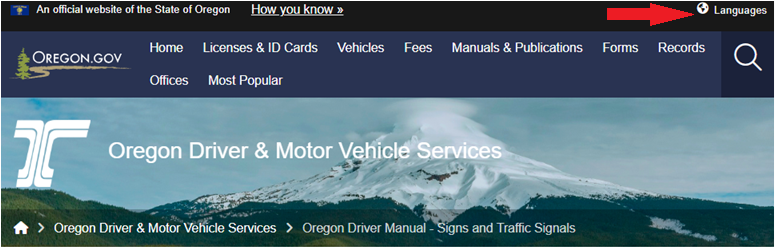 The Oregon Driver Manual is online in English and Spanish, and it is also accessible to web translation tools. It has information about road signs, traffic laws and other information you need to know to drive in Oregon, and to pass the standard Knowledge Test (for Class C non-commercial).  Use the languages function (upper right-hand corner of the webpage) to translate the manual to whichever language you prefer.​