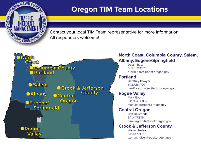 Oregon’s Traffic Incident Management Program is dedicated to improving the on-scene safety of our first responders, reliability of our highways and livability of our communities by increasing outreach and awareness of TIM practices.