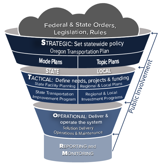 At the top level, federal requirements and state laws and goals set the context for what to consider in meeting the transportation needs of the state. The Oregon Transportation Plan with its mode and topic plans sets direction and policy as the state's long-range multimodal plan. At the next level are regional and local long-range system plans and capital improvement plans. This represents enacting policies and programs, implementing solutions, and building projects as a collaboration by ODOT, cities, counties, tribes, and others. Reporting and monitoring on how these solutions meet goals and targets takes place at all levels and informs further activities and plan updates.