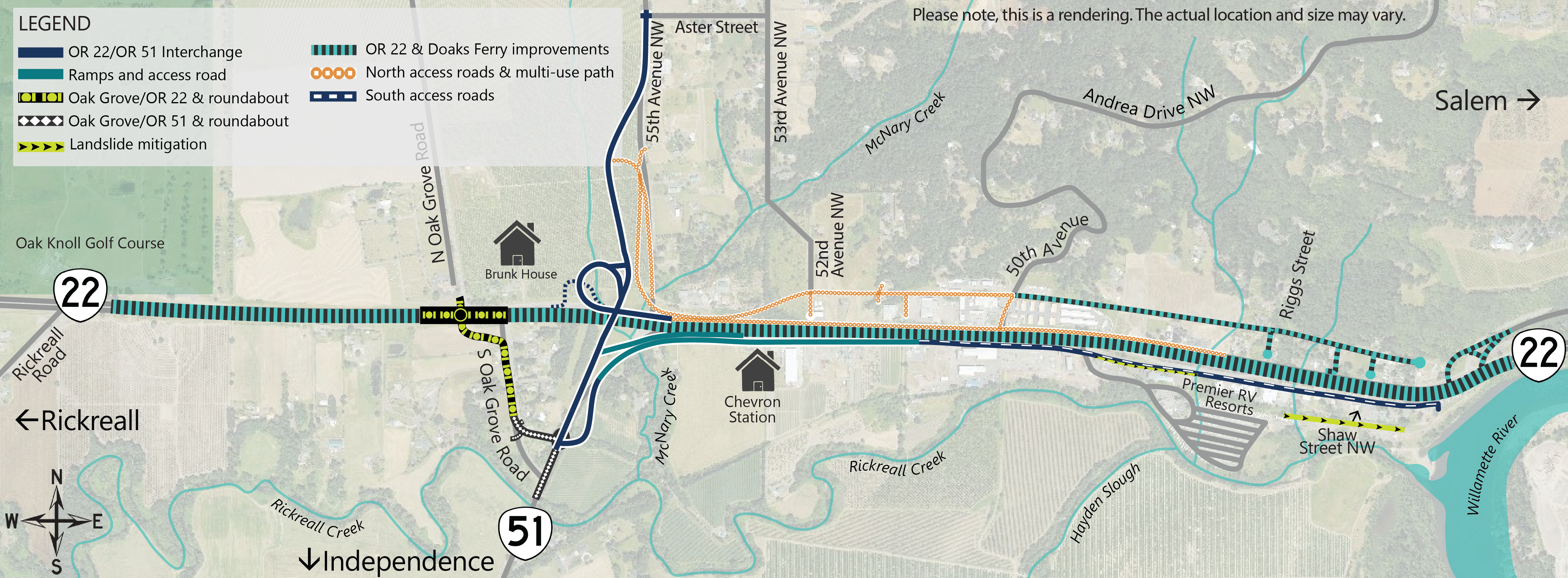 - Adding a roundabout on OR 22 to realign the staggered N. Oak Grove Road and S. Oak Grove Road intersections.